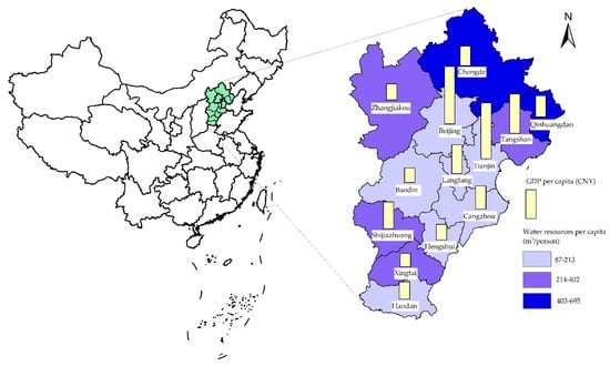 Given the tremendous increase in water demand, also accompanied by population expansion, rapid urbanization, as well as economic booms, the issue of water scarcity has intensified and is now jeopardizing food security, regional stability, and sustainable development in many areas [1,2,3,4]. Currently, an estimated 3.6 billion people (almost half of the global population) live in areas that may face water scarcity for at least one month each year, and this number may increase to around 4.8–5.7 billion by 2050 [5]. In this context, a major challenge for governments is to enable the supply of water for domestic consumption in urban communities located in semi-arid environments, such as California, Brazil, the Middle East, and northern China [6], where the economic impacts of water scarcity are increasing [7,8]. China is, thus, a country under great pressure from water shortages, with its per capita occupancy of water resources being 2074.5 m3 in 2017 [9], less than a quarter of the world average level. The Beijing-Tianjin-Hebei (BTH) city region in northern China faces the most severe water shortages [10].