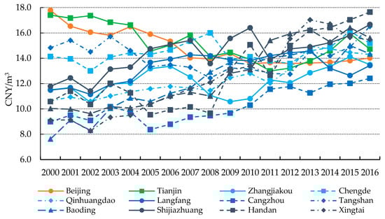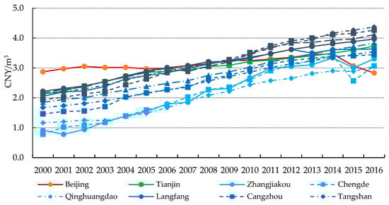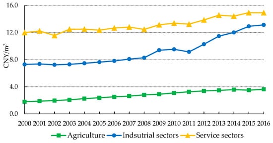 The shadow prices of production water use in the BTH city region show prominent sectoral variations (Figure 2). Generally, the shadow price of agricultural water use is the lowest, with the average price ranging from 1.8 CNY/m3 to 3.8 CNY/m3 during 2000–2016. The shadow price of industrial water use is significantly higher, from 7.3 CNY/m3 to 13.1 CNY/m3 during 2000–2016. The shadow price of service water use is the highest, from 11.6 CNY/m3 to 14.9 CNY/m3 during 2000–2016. The sectoral variation of shadow prices may be relevant for the following reasons. First, the cost to make the water use meet the requested standard varies by sector. It is more expensive to meet the high standard of water quality in service sectors, since they are closely related to human health and life security, while it is much cheaper for agricultural water use. Second, marginal revenue varies by sector. Generally, marginal revenue in service sectors is higher than in industrial sectors, with the one in the agricultural sector being the lowest.