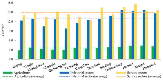 There are significant spatial differences in the shadow prices of production water in the BTH city region in 2016 (Figure 3). The cities in southern Hebei (i.e., Shijiazhuang, Handan, Xingtai, and Hengshui) have higher shadow prices of production water, with the shadow prices of water use in agriculture, industrial sectors, and service sectors exceeding the average level in the entire BTH city region. The shadow price of agricultural water use in Beijing is 2.8 CNY/m3, the lowest in the region, whereas those of agricultural water use in the cities of southern Hebei are all above 4.0 CNY/m3, higher than all the other cities in the region. The cities in northern Hebei have the lowest shadow prices of industrial water use, especially Qinhuangdao, where the shadow price of industrial water use is 9.8 CNY/m3, 38% lower than the highest ones in Shijiazhuang and Xingtai in southern Hebei. The shadow prices of service water use in most cities in northern Hebei, Beijing, and Tianjin are lower than that in southern Hebei. The exception is Tangshan, whose shadow price of service water use is 16.5 CNY/m3.