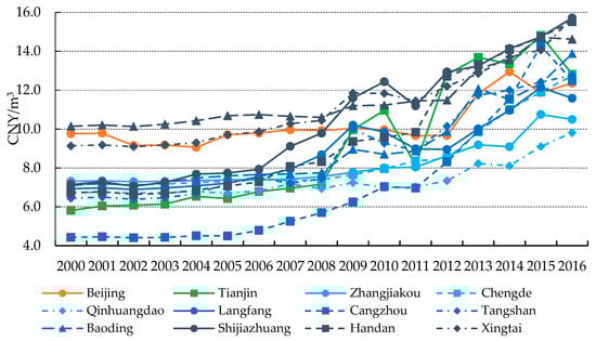 The reasons for the regional discrepancies in water scarcity may be attributed to the following factors. First, Beijing and Tianjin have better access to more advanced technologies for water saving and more stringent environmental regulations. Although technology development has also improved the water use efficiency in Hebei, it is not sufficient to offset its huge water demand due to rapid industrialization and urbanization, let alone for the cities in southern Hebei (i.e., Hengshui and Xingtai), where water-saving measures have not been fully implemented and the relevant regulations are rather loose. Second, the water prices in Beijing and Tianjin are higher than in Hebei, which contains the expansion of its water demand to some extent. In 2016, the actual prices of industrial water in Beijing and Tianjin were 9.92 CNY/m3 and 7.85 CNY/m3 respectively, while the average industrial water price in Hebei was 5.06 CNY/m3. The difference in water pricing for the service sector is greater, especially for special industries (the industries that use water as raw material for production, mainly including bathing, car washing, etc.). Beijing’s water price for special industries is 161.68 CNY/m3, higher than Hebei’s, where the average price is 21.5 CNY/m3. Moreover, the regional discrepancy in water endowment is also relevant to the regional differences in water scarcity.