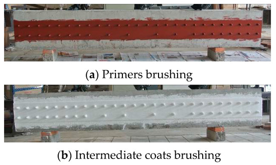 The fire protection material used for P2B1-MOCT and P3B1-MOCT was the Interchar 1120 brand supplied by AkzoNobel Ltd. Co. (Amsterdam, Netherlands). The material should be applied at air and substrate temperature between 10 °C and 40 °C, and a relative humidity less than 80%. The fireproof coating could intumesce at elevated temperature, thus providing an insulating layer on the specimen surface and preventing it from being heated up too rapidly. The construction steps were as follows: