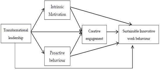 The past century has witnessed dynamic changes in competition, globalisation in the workforce, the internationalisation of business and its operations, and information and communication technology [1]. These issues demand that business enterprises creatively engage in their activities to survive the competition by providing innovative solutions [2,3]. In effect, research on creativity and innovation has experienced robust growth in the last few decades [4]. Recent studies shed light on employees’ autonomy, motivation, and engagement in accelerating creative efforts [5,6,7]. However, in most of the studies, creativity is conceptualised as an outcome of a creative effort, and the creative process engagement (CPE) component, which precedes the creative outcome, is ignored [8,9]. With the interplay of the CPE’s constituents, such as problem identification, information search, encoding, and idea generation, employees generate creative ideas to resolve the prevalent problems in the organisation [8,10,11]. Until recently, little has been known about CPE’s contribution to sustainable innovative work behaviour (IWB) due to the limited literature [8,10]. Studies have claimed that employees, when led by a supportive [12] and non-controlling leader, such as a transformational leader, exert creativity in doing things [8,13]. Therefore, the organisation needs transformational leadership (TL) to foster employees’ proactive behaviour and CPE to propel a sustainable innovative organisation in the long run so that competitiveness is assured.