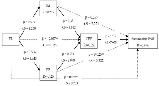 Table 5 shows that the unmediated relationship between CPE and sustainable IWB (β = 0.648, t = 12.748, p < 0.00), TL and CPE (β = 0.315, t = 5.038, p < 0.00), IM and sustainable IWB (β = 0.497, t = 8.100, p < 0.00), proactive behaviour and sustainable IWB (β = 0.371, t = 5.277, p < 0.00), and TL and sustainable IWB (β = 0.369, t = 5.503, p < 0.00) are significant. Therefore, it can be claimed that all the predictor variables mentioned in Table 5 significantly influence their explained variables.