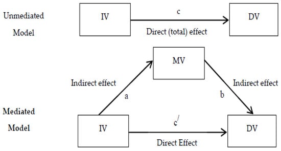 The necessary condition of a mediation effect is to have a significant direct effect (such as c in Figure 3) of the independent variable on the dependent variable before adding a mediating variable [81,82,83]. Table 3 shows that all the independent variables have significant effects on dependent variables. Figure 3 demonstrates the mediated and unmediated relations in a structured model. Sufficient conditions for a mediation effect are, first, that the independent variable must affect the mediating variable significantly; secondly, both independent variable and mediating variable must also predict the dependent variable significantly; and lastly, the significant direct effect (c/) of the independent variable on the dependent variable must disappear (for full mediation) or reduce (for partial mediation) when the mediating variable is used in the previous unmediated relationship [81,82,83].