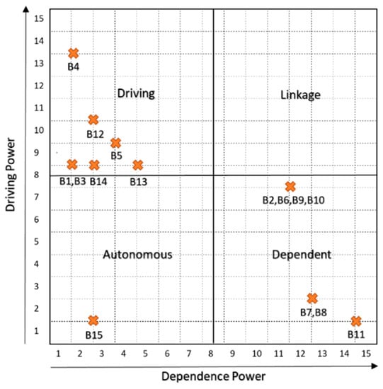 The Cross-impact Matrix Multiplication Applied to Classification (MICMAC) technique was used to classify identified barriers based on the measurements of driving power and dependence power. This method was developed by Duperrin and Godet [54] to study the diffusion of barrier impacts through reaction paths and loops and develop the hierarchies between barriers. According to the MICMAC method, some barriers have driving power, others have dependence power (or driven power). Classifying these two types of barriers can present a clear profile about the intricate relationships between the barriers [50,55].