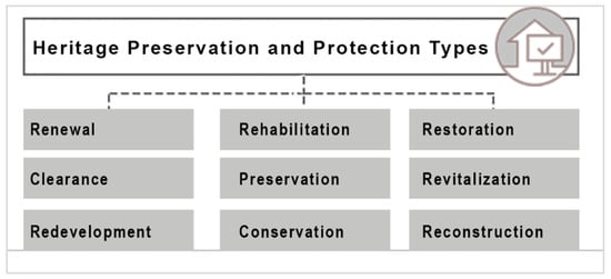 In order to comprehend the importance of heritage protection the present research has identified the various types of intervention in cultural built heritage context. It is associated with its role and definition as per the following (Figure 1) []: