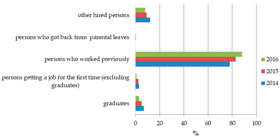 Hired full-time employees in the years 2014–2016 in the mining and quarrying industry; own elaboration based on References [29,30].