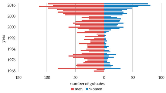 Changes in the number of students graduating from mining and geology major were analyzed in a much larger time period covering the years 1968–2017, on the example of the Wrocław University of Science and Technology. Such a time period allows us to conclude which factors have an impact on the number of graduates and the percentage share of women in this group. Only those graduates who obtained a diploma were included in the analyses. It was assumed that they often search the labor market for employment compliant with their education. The number of women and men graduating from the Faculty of Geoengineering, Mining, and Geology (former Faculty of Mining), in the scope of a full-time course, is shown in Figure 2.