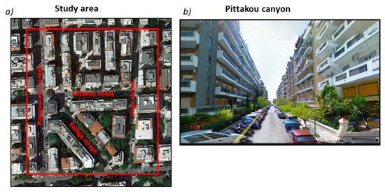 (a) Google earth image of the study area, indicating the main street canyons, (b) Street view of Pittakou street canyon in which the building unit, the energy performance of which will be assessed, is located.