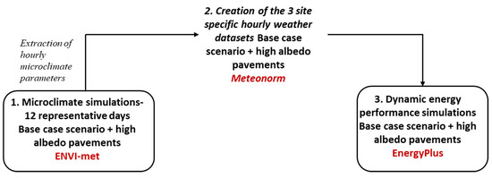 As a first step, a microclimate model of the study area, in which the examined building unit is located, is created in the ENVI-met model. Microclimate simulations are then performed for the case study area surrounding the examined building unit, for 12 representative days (one for each month), defined through a detailed statistical analysis of long-term climatic records. The microclimate simulations concern both the existing conditions, in which the ground surfaces are covered with conventional paving materials but also the high albedo pavements, both for the design and the aged albedo values. At a second step, the major microclimatic parameters, estimated in front of the examined building unit are extracted from the ENVI-met model and their average values are introduced in Meteonorm weather generator to stochastically create the site-specific, annual climatic datasets, henceforward entitled ’urban specific weather datasets’ (USWDs). A total number of three USWDs is created: one for the current conditions and two for the scenarios of the cool pavements. The generated, hourly weather datasets, representative of the microclimatic conditions of the urban site (before and after the high albedo pavements applications) are then used as an input boundary condition for the building unit’s dynamic energy performance simulations with the EnergyPlus model. The detailed procedure to create an USWD, reflecting the microclimatic conditions in the near vicinity of a building, is presented in detail in a previous scientific work of Tsoka et al. [63].