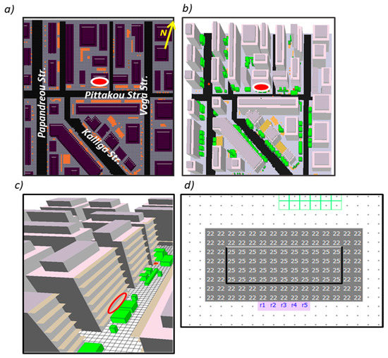 In the current study, microclimate simulations are conducted with the ENVI-met v.4 microclimate model. ENVI-met is based on the fundamental laws of fluid dynamics and thermodynamics and can simulate complex surface–vegetation–air interactions in the urban environment. The detailed characteristics of the model along with its structure and the mathematical equations governing the various sub-models (i.e., atmospheric, soil and vegetation sub-model) are provided in [64]. In order to assess the microclimatic conditions of the study area under different meteorological conditions and to acquire the necessary data for the creation of the USWDs, microclimate simulations are performed for 12 representative days, one for every month. The detailed procedure for the selection of the 12 representative days is given in [63]. The area input file of the case study area along with the position of the generic one-floor building unit, the energy performance of which will be assessed, are given in Figure 3a–c. The study area is modeled using a domain size of 135*135*20 grids (i.e., x-grids*y-grids*z-grids), corresponding to a grid size of 1.5 m*1.5 m* 3.0 m. Building floors have a height of 3.0 m height whereas, the height of the base floor was considered as 4.5 m high; seven nesting grids were also set around the model domain area and the total runtime for each representative day is 24 hours. Moreover, five receptor points, providing hourly simulation results from the ground level till the top of the domain, have been set in front the examined building unit, at a distance of 0.75 m from the building unit’s façade (Figure 3d). The meteorological boundary conditions, including wind speed, wind direction, hourly values of Tair provided from the weather station of the Aristotle University in Thessaloniki and RH, used for the forcing along with the mean monthly value of soil temperature, have been from the weather station of the Aristotle University in Thessaloniki. Finally, the thermal properties of the various construction materials are based on the ISO standard 10456 [65]. The following scenarios are simulated.