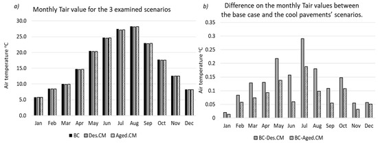 (a) Mean monthly values of Tair for the 3 USWDs, corresponding to the base case scenario and the cool pavements’ applications and (b) the estimated differences on the monthly Tair values due to the cool pavements’ applications, having the design or the aged albedo values.