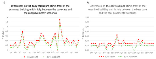 Evolution of the differences of (a) the daily maximum and (b) the daily average Tair in front of the examined building unit in July, between the base case and the cool pavements’ scenarios.