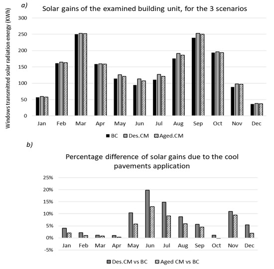 The simulation output of the annual heating and cooling energy needs of the investigated building unit, both for the existing conditions and after the application of the cool pavements is depicted in Figure 7, while the respective energy savings due to the high albedo materials are shown in Table 2. It can be generally said that the replacement of conventional asphalt and concrete paving materials with the corresponding high albedo ones only provide minor changes on the building unit’s energy performance, even in the case of the design albedo values (i.e., when no albedo degradation is considered). More precisely, the estimated annual heating energy needs of the examined building unit, are marginally higher by 0.75% in the case of the design cool materials compared to the base case scenario. This is due to the slightly lower ambient Tair values, estimated inside the study area, after the cool pavements’ application (see Section 4.1) which is not however counterbalanced by the small rise of solar gains (see Figure 8).