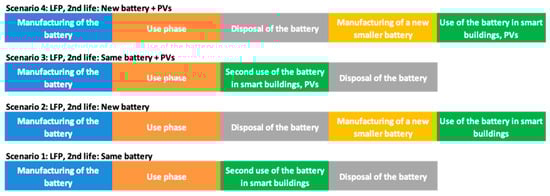 It is estimated that LFP batteries can support at least 2000–2500 cycles in electro-mobility applications, for example, daily use of a charge and discharge cycle for seven years, until the remaining capacity reduces to 80% of the initial battery capacity. This allows its use for another 1000–2000 cycles until the capacity reduces to 60% of the initial capacity. When this occurs, the aging process of the battery has advanced to point that the voltage drop does not allow further use of the battery [30]. After the end of the useful life of a battery for electro-mobility purposes, typical applications include its use as energy storage unit in smartgrids or uninterruptible power supply. The main characteristic of these applications is the lower stress that the battery cells suffer, enhancing thus the durability of the battery pack. In the context of this work, the primary use phase considers a 24 kWh LFP battery with efficiency of 80% used for 2500 days in an EV, while the second life application considers the case of using an LFP battery as an energy storage unit in a smart building for 1500 days (or equivalently, four years), taking into account the average home consumption in Spain in 2010. In the scenarios that refer to the use of the same battery in the primary and secondary application, it is further assumed that the efficiency drops from 80% to 75% due to the aging of the battery.