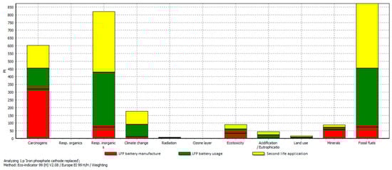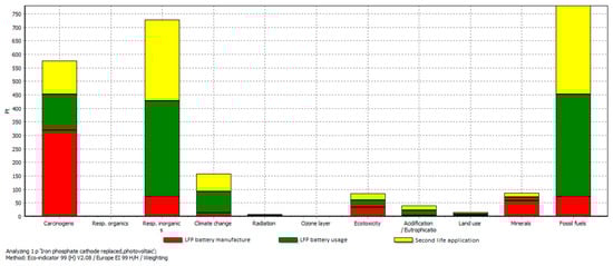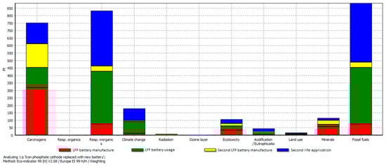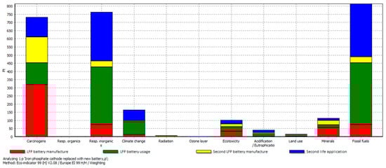 Scenario 4 is similar to scenario 2, which introduces a new battery with a smaller capacity of 12 kWh for the second life application after the first battery is degraded by its use in the EV, with the difference that the PVs are the energy source in the smart building (instead of using the Spanish electricity mix). Specifically, this scenario includes five stages: (i) the manufacturing process of the first battery; (ii) the use phase of the first battery in the EV for 2500 days; (iii) the disposal of the first battery; (iv) the manufacturing process of the second battery with the same technology but smaller capacity; and (v) the use phase of the second battery (second life application) in a smart building using the PVs as the energy source for 1500 days. Similarly to the previous scenarios, the evaluation of the disposal phase is omitted due to the lack of relevant data for battery recycling options (that represent more realistically the possible end-of-life treatment options for the EV batteries) in the life cycle inventory employed in this work, given that it is common for all the alternative scenarios under study. The single score of the two LFP batteries for scenario 4 with respect to their manufacturing process and corresponding use phases, obtained by using the Eco-indicator 99 method and disaggregated per impact category, is given in Table 4.