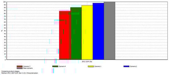 This section presents a comparative analysis of the scenarios under study on the basis of the global warming potential (GWP) indicator, which is a measure of how much energy the emissions of one unit of a gas will absorb over a given time interval relative to the emissions of one unit of CO2. The method employed in this work is the IPCC 2007 GWP 20a, thus the total contribution to global warming is calculated (in kg of CO2 equivalent) for a period of 20 years. The results are given in Figure 6 as a percentage in comparison to the scenario with the highest value, namely the base scenario (in grey color), which represents the production of two identical batteries and their use phase in an EV for 2500 days each, thus a total of 5000 days (see Section 2.5). As the duration of the base scenario differs from the functional unit in scenarios 1–4, the former is used only as a reference for comparison purposes.
