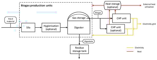 Input materials are stored in silo facilities when delivered before they are transferred to digestion units. If biogenic waste of animal origin is used as input material, it must run through a hygienization process and be heated up for sanitation purposes according to EU regulations [] before it is digested. Biogas is produced in the digesters that is then stored in a biogas storage or transferred to the CHP units. Double membrane biogas storages were considered in this work, which are installed at the top of the digesters (internal gas storage). One CHP unit was considered in the basic plant concepts, while a second CHP unit was added in two flexibilization concepts described in Section 2.1. The fermentation residue (digestate) is stored in residue storage tanks before it is transferred to agricultural fields and spread as fertilizer. Biogas is converted to electricity and heat by CHP units. A share of the produced heat is used to cover the heat demand from the plant’s biogas production units. The remaining heat is either used to cover an external heat demand or is considered as losses. In case of discontinuous heat generation due to flexible electricity generation, a heat storage was considered to ensure continuous heat output. Part of the generated electricity is used to cover the plant’s electricity demand and the rest is fed into the electricity grid.