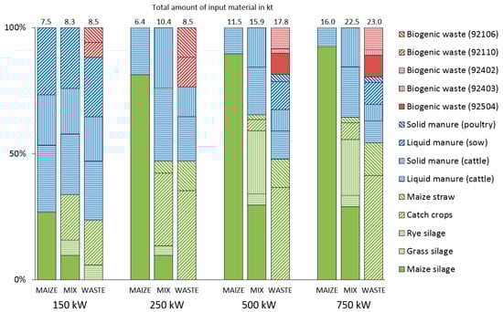 Three different input material mixes were considered for each of the four investigated biogas plant sizes, resulting in a total of 12 plant configurations. The three mixes consist of varied compositions of energy crops, farm manure and biogenic waste, defined as MAIZE, MIX, and WASTE. The input material compositions for each of the plant configurations are shown in Figure 2. Different types of biogenic waste are categorized by common Austrian numeric codes []; a description of these categories is in the caption for Figure 2. The composition of each mix was chosen to represent input material mixes that are typically used at Austrian biogas plants, whereas the configurations for 500 kW biogas plant MAIZE and MIX refer to Stuermer []. The configuration MAIZE has a high share of maize silage, whereas the configuration WASTE has no maize silage but a share of biogenic waste. No biogenic waste of animal origin was considered in the WASTE mixes for the smaller biogas plants with 150 kW and 250 kW, as this would result in inefficiently high investment needs for substrate pretreatment (hygienization). The input material mixes for the 150 kW plant were chosen to correspond to the regulations stipulated in Austria’s 2017 Amendment to the Green Electricity Act (share of grain and corn (combined) less or equal 30%).