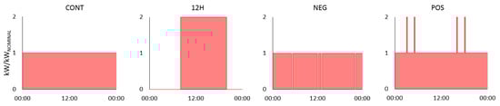 Four potential modes of plant operation (power generation scenarios) were investigated and compared, which are schematically shown in Figure 3. Scenario CONT assumes continuous power generation (base load) and represents a reference scenario, as the majority of biogas plants in Austria are currently operated as base load power plants. Scenario 12H assumes power generation only occurs by day between 08:00–20:00 by doubling the CHP unit capacity compared to the nominal capacity. Continuous power generation was also assumed in scenarios NEG and POS, whereby participation in the markets for negative (NEG) and positive (POS) secondary control energy reserves was considered. Doubling of the CHP unit capacities was also assumed in scenario POS.