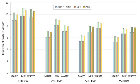 Figure 4 shows biogas plant investment costs calculated for each biogas plant configuration and power generation scenario. Investment costs for scenarios 12H and POS are considerably higher than for scenarios CONT and NEG, mainly due to additional investments in CHP unit and gas storage capacity. Investment costs for biogas plant configurations with MIX and WASTE as input material mixes are higher than configurations considering MAIZE as input material mix, as additional investments in substrate pretreatment units (hygienization) are necessary.
