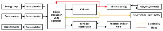 The scope, described within Figure 5, begins at feedstock supply and cultivation. This includes cultivation and harvesting for energy crops. Farm manure is considered as a waste product from livestock farming and therefore was assumed to have zero emissions from livestock farming. However, it is usually stored in a way where methane emissions are common and therefore, within this LCA, these emissions were considered as avoided GWP where farm manure is not stored but processed within biogas plants. Biogenic waste is considered as a waste product from the food industry and thus was also assumed to have zero emissions. The transportation of these different feedstock types to biogas plants was included in the assessment, as well as the conversion into biogas within biogas plants. Fermentation residue is included as part of the LCA scope by substituting mineral fertilizers (nitrogen, phosphorus, and potassium) while also accounting for the ammonia emissions from the fermentation residue application on the agricultural fields. The combustion of biogas in a CHP unit to yield electricity and heat was inside the scope. The CHP unit supplies the electricity and thermal energy to cover biogas plant demands. The functional unit was set to 1 MWh of electricity fed into the grid and the coproduced thermal energy was substituted for other conventional thermal energy sources.