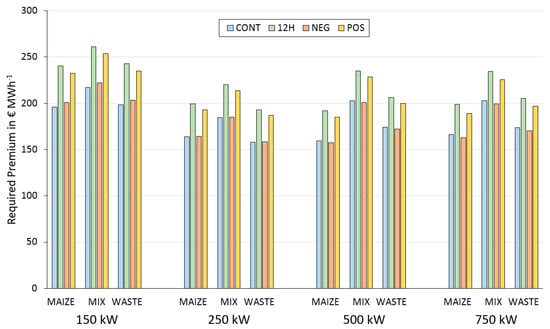 Capital and substrate costs represent the highest cost factors for each scenario, followed by the annuity of operational costs. Revenues that are obtained from participating in the market for secondary control energy reserves in scenarios NEG and POS are considerably lower than revenues from the spot market and heat sales. The total annuity is negative for all biogas configurations and scenarios due to the prices at the spot market during the observed period, which were far lower than the electricity generation costs. The average EPEX spot market price was 34.8 € MWh−1, whereas electricity generation costs for Austrian biogas plants typically range from about 200–350 € MWh−1 depending on input material composition and plant size []. An additional payment (premium) to the electricity market price was calculated for each scenario, which is required to make power generation economically viable (total annuity of 0). The needed premium for each scenario and plant configuration can be seen in Figure 6 and lies in the range of 157.3 € MWh−1 (500 kW-NEG-MAIZE) to 260.9 € MWh−1 (150 kW-12H-MIX). Within the smaller biogas plants with an electric rated output of 150 kW and 250 kW, the lowest premium is needed for scenario CONT; within the larger plants with the 500 kW and 750 kW scenarios, NEG proved to need the least amount of premium. Biogas plant configurations with a MIX input material composition need considerably higher premiums compared to the other mixes.