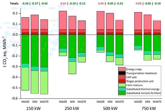The electrical efficiency parameter variation showed the influence on GWP impacts. When the electrical efficiency is increased, CHP unit emissions are reduced along with the substitution potential of the co-products and the avoided emissions from farm manure. A similar but inverted effect can be observed when decreasing the electrical efficiency: Here, CHP unit emissions are increased together with the substitution potentials and avoiding emissions from farm manure. When maize is the dominant input material, it is of high ecological interest to increase the electrical efficiency. For the other input material compositions—MIX and WASTE—the sensitivity analysis shows that higher GWP savings are obtained by decreasing the electrical efficiency. However, this deduction must be handled with caution, as this would imply using the biogas only for thermal energy substitution and other credits. However, these saving potentials assume that thermal energy is required to meet an already-existing heat demand and can be substituted through this co-product. The same applies for the mineral fertilizer substitution.