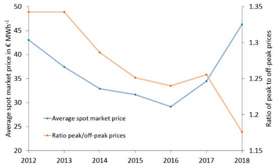 Development of the average spot market price and the ratio of peak and off-peak prices at the EXAA during 2012–2018. Adapted from [].