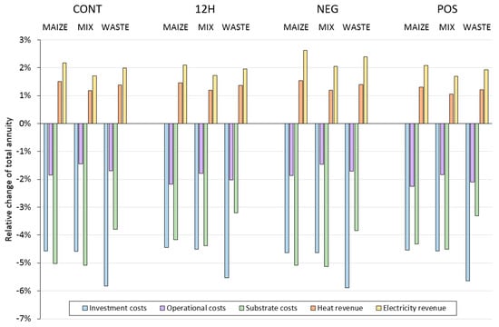 Figure 9 shows the results of a sensitivity analysis regarding the effects on the total annuity while increasing different costs and revenues by 10%. Investment costs, operational costs, substrate costs, heat revenue, and the revenue from the electricity market were successively increased and the relative change to the base case is shown representatively for the 500 kW biogas plant as this is the most common plant size in Austria. Investment and operational costs as well as revenues from the electricity market are shown to have the biggest influence on the results.