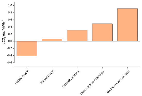 Additionally, LCA and the GWP impact category were used to investigate the environmental impact of biogas plants. The results ranged from –0.42 to 0.06 t CO2 eq. MWh−1, clearly showing that the 150 kW plant configurations yielded the best outcome. Within the input material variation, MAIZE configurations demonstrated the poorest performance for each investigated plant size. A sensitivity analysis of CHP unit electrical efficiency showed that by increasing the efficiency, less GWP occurs from the polluter modules, while the credit from the co-products and emission savings from farm manure processing also decreases. Concerning the co-product of excess thermal energy, if heat from light fuel oil is substituted instead of heat from wood pellets, the GWP saving potentials are even higher. Compared to conventional electricity sources (electricity grid mix, natural gas, hard coal), electricity from biogas plants showed a better performance within the GWP for all investigated plant configurations.