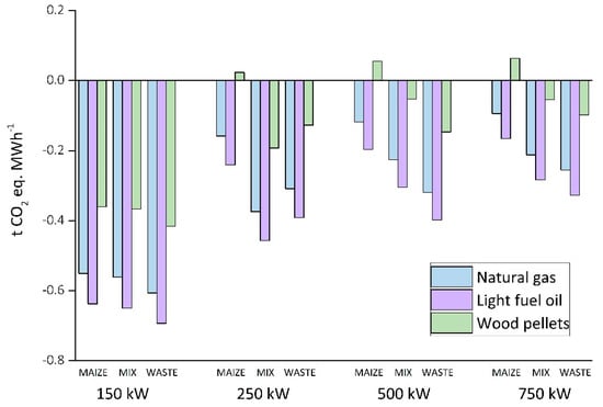 Substituting thermal energy from wood pellets provides one viable option for heat utilization. However, thermal energy is often also generated from natural gas or light fuel oil. The type of thermal energy source substitution depends on the already-existing local heat supply infrastructure of each specific biogas plant. The calculated results for the biogas plant configurations of these two additional options show a further improvement of the GWP balance, as shown in Figure 11. When substituting fossil thermal energy sources, every scenario results in a GWP saving. The highest GWP saving potential is again visible for 150 kW setups and the best results are achieved when substituting light fuel oil.