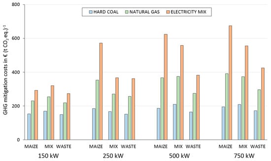 GHG mitigation costs were calculated by relating the needed premium to the CO2 eq. saving potential when comparing power generation with biogas plants to hard coal and natural gas power plants and the Austrian electricity grid mix and ranged from 149.5–674.1 € (t CO2 eq.)−1.