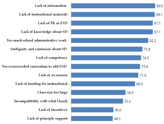 The mean scores of Turkish elementary teachers’ responses on commonly perceived barriers to ESD were lack of the knowledge about SD (4.67), lack of knowledge about teaching SD (4.78), lack of instructional materials (4.40), large class sizes (4.28), lack of principal support (4.23), and lack of funding (4.14) []. In a survey, 92% of Australian teachers surveyed think that SD is important, of value to students, and should be integrated into the curriculum. However, 80% of teachers are either unaware of ESD or lack a clear understanding of SD. Additionally, teachers pointed out a lack of a definition for SD (64%), lack of information about how SD relates to various subjects (56%), and curriculum materials such as syllabuses (46%) [].