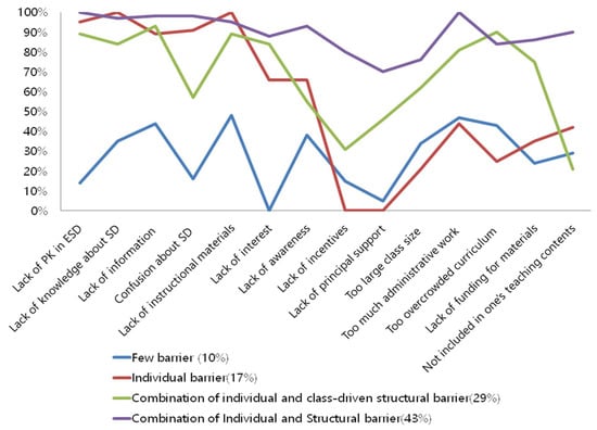 Secondly, this study confirmed interactions between barriers and co-occurrence of teachers’ perceived barriers using LCA. Furthermore, this survey identified four types of teachers exhibiting different profiles of perceived barriers to ESD implementation by LCA: the few barrier type (10%), the individual barrier type (17%), the combination of individual and class-driven structural barrier type (29%), and the combination of individual and structural barrier type (43%).