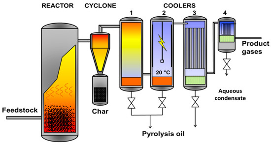 11]. Pyrolysis can be categorised into slow, medium and fast pyrolysis. In fast pyrolysis, the decomposition of feedstock occurs rapidly, resulting in the production of vapour and aerosols and smaller amounts of biochar and gas. Following condensation, a dark-brown homogenous liquid is formed, with a calorific value roughly half that of fossil fuel oil [