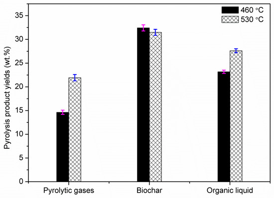 17]. Recently, an experimental analysis of slow pyrolysis of poultry litter was investigated at different temperatures using a laboratory-scale fixed-bed reactor. The pyrolytic gases evolved were estimated to be energetically adequate for the process to be self-sufficient. The energy transfer analysis showed that one-third of the heating value of the poultry litter was transferred to the organic liquid condensate and roughly the same was retained in the char. In this study, the maximum fraction of liquid condensate that could be upgraded to liquid biofuels was reported to be obtained at 550 °C [