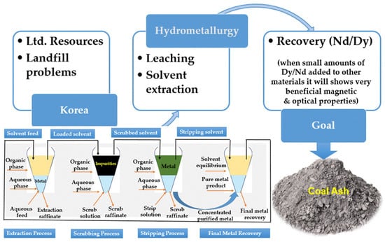 In Korea, there are limited resources of rare earths and at the same time having landfill (coal ash residues, municipal solid waste residues, etc.) problems. To resolve these problems, efficient recycling technologies are required and adopted. A considerable recovery of critical rare earths such as yttrium, neodymium and dysprosium can be achieved through a systematic combination of leaching and solvent extraction. The Nd/Dy significantly enhances the magnetic and optical properties by the addition of small amounts to other materials. The overall rare earth recovery process from coal ash samples is depicted in Figure 1.