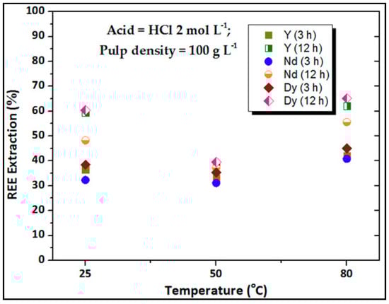 The effect of parameters on the leaching of metals was investigated and summarized []. Raising the temperature is believed to enhance the solubility of metals in the leaching process. A series of tests were performed to investigate the effect of temperature on the leaching of yttrium, neodymium, and dysprosium from Samcheok CFBC bottom ash. In these tests, the acid concentration, shaking speed, and pulp density was fixed at 2 mol L−1, 200 rpm, and 100 g L−1, respectively. The temperature was varied in the range of 25–80 °C. The leaching experiments were conducted for 3 and 12 h for each of Y, Nd, and Dy. Figure 2 shows the effect of temperature on the REE extraction. When the residence time was 3 h, the leach rare earths first decreased and then increased with increasing temperature. At a temperature of 80 °C, the concentration of rare earths in the leachate reached its maximum. The similar trend was also observed in 12 h leaching tests.