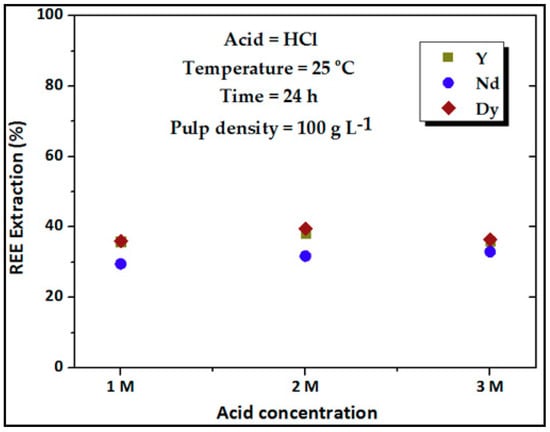 The reagent concentration was reported to have a significant effect on the dissolution of metals in the leaching process []. The leaching rate rose linearly as the concentration raising until it reached the peak. After this point, the increase in the agent concentration did not provide a higher leaching rate, in addition, causes a slight reduction. The influence of agent concentration on the leaching rate of yttrium, neodymium, and dysprosium was checked by varying the concentration of hydrochloric acid in the experiments. Hydrochloric acid at the concentrations of 1, 2 and 3 mol L−1 was sequentially adopted while the temperature and time were fixed at 25 °C and 3 h, respectively. As shown in Figure 3, the concentration of yttrium and dysprosium in the leach solution increased with the increase of hydrochloric concentration from 1 to 2 mol L−1 and then decreased when the hydrochloric concentration was 3 mol L−1.