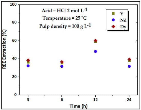 In order to explore the effect of the residence time of leaching test on the leaching of yttrium, neodymium, and dysprosium by utilizing hydrochloric acid 2 mol L−1, the residence time was varied from 3 to 24 h. At the temperature of 25 °C, the leach rare earths initially increased (Figure 4) and attained a peak after 12 h. But it followed by the reduction of leach rare earths as the residence time for leaching continually increased up to 24 h.