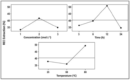 Preliminary results were input to Minitab software to explore the relationships among leaching variables (concentration, time, temperature) and leaching efficiency of yttrium, neodymium, and dysprosium. ANOVA analysis of main effects plot to was outlined in Figure 5. The trends of rare earths content in leach solution due to varying the variables’ value (Figure 5) are similar to the scatter plot of rare earths leach with respect to variation of temperature (Figure 2), hydrochloric concentration (Figure 3), and residence time (Figure 4). The respective values of the concentration, time, and temperature of 2 mol L−1, 12 h, and 80 °C are proposed to be optimal conditions for leaching targeted rare earths from Samcheok CFBC bottom ash.