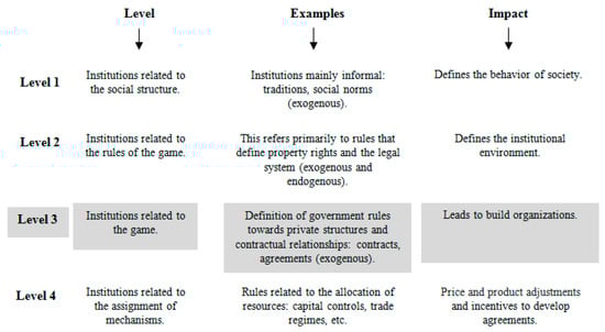There are three ways to classify institutions [], according to the degree of formality, the scope of action, and the levels of hierarchy. The degree of formality has to do with the rules that regulate the institutions. Formal rules can be classified into constitutions, laws, property rights, common laws, contracts, and statutes, while informal rules are the norms of behavior sanctioned by society (traditions and beliefs). Depending on their scope of action, institutions can be economic, political, legal, or social. Finally, regarding the different levels of hierarchy, Williamson [] proposed the differentiation that appears in Figure 1. It should be said that, given the objectives outlined in the Introduction, we raise issues related to the level of hierarchy 3; that is, we take into account the relationships between public and private institutional structures.