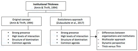 From different perspectives institutions have been considered central elements in explaining the evolution of regional economies and a wider group of researchers have increasingly generated empirical and analytical evidence of their role in regional development processes [,]. In this context, Institutional Thickness, theorized by Amin and Thrift [], is considered a key condition to promote economic development as well as mobilize actors, organizations, and resources.