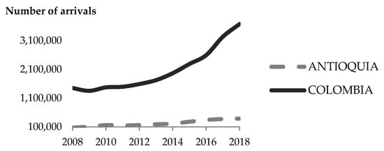This evolution has occurred in the context of the relevant growth of tourism not only in Antioquia, but also in Colombia (see Figure 3) during the last 10 years []. Specifically, while the growth rate of tourist arrivals worldwide was 7% in 2017, in Colombia it was 28% over the last 10 years.