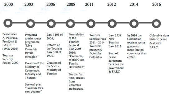 In this line, Figure 4 summarizes the main events that have marked the tourist development of the country since 2000 and the strategic decisions that help to make Colombia a tourist destination. In addition to the many implemented decisions concerning security, three key events can be highlighted as the basis for the development of the tourism sector: the creation of the Vice Ministry of Tourism (2006); tourism sectoral plan Colombia world-class tourist destination (2008–2010) within which the successful international communication campaign was launched, name of the campaign: Colombia the only risk is wanting to stay; and finally one of the most recent historical milestones, the signing of the Peace Agreement between the government and the FARC (2016).