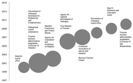 Figure 5 shows how Antioquia made progress in the creation and consolidation of key institutions to support regional development in tourism during the study period. The institutional integration between the public and private sectors was also formalized with the creation of the Business Tourism Cluster, and Medellín Convention and Visitors Bureau. In addition, a national context of opening new airlines, hotels, and theme parks and the creation of the Vice Ministry of Tourism in 2006 was transcendent.