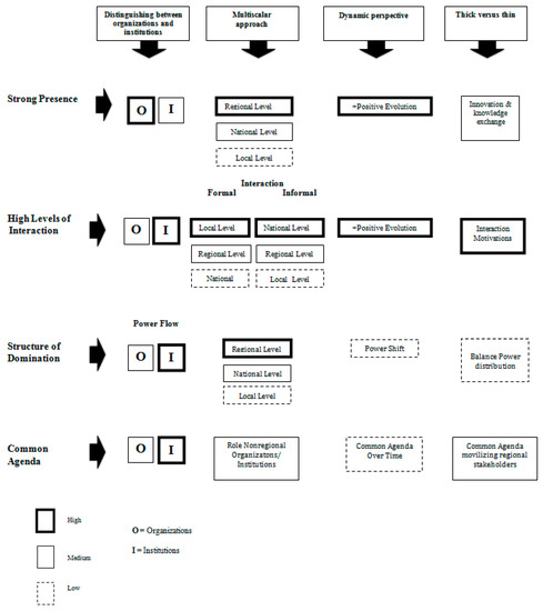 Recent discussions on differences in development between different regions highlight the importance of institutions [,,]. The concept of institutional thickness can therefore be conceived as a building block for an analytical and replicable approach to the analysis of the role of institutions in regional development []. Institutional thickness refers to the density of institutions and organizations that act in a territory to promote development actions. It is characterized by four main elements: strong institutional presence, high levels of interaction between institutions and organizations, domain structures and/or coalition patterns, identification with a common agenda or mutual awareness.