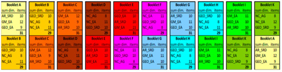 As shown in Figure 1, the initial pool of 300 items was administered over 10 test booklets (A–K) to a sample of 1683 fourth grader students. Every booklet consisted of about 30 items ranked by increasing difficulty. Consequently, we expected a very large number of students to initially respond correctly and this number to decline with the increasing difficulty, to reach the smallest number for the most difficult items, which only the most competent students could answer correctly (from three out of the six identified dimensions of mathematical knowledge). As each booklet covered only three of the six mathematical dimensions, they were combined and administered in pairs, to guarantee items from all six dimensions. Furthermore, every booklet was included in two different pairs, in different order.