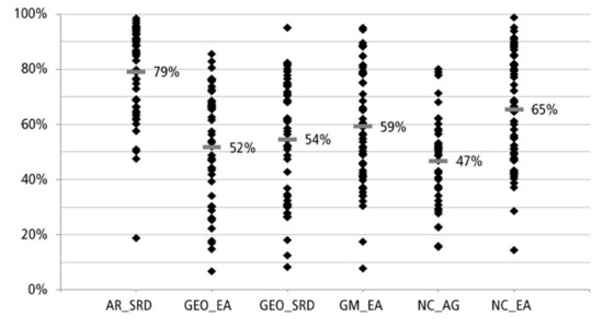 The difficulty of an item was represented by the percentage of students that solved it correctly. It can be expected that most of students have an average mathematical ability, consequently items should have average difficulty (i.e., a percentage of correct answer between 25% and 75%). Figure 2 shows the percentage of correct responses per item for each of the six dimensions. While the dimension “AR_SRD” presented a few items difficult to very difficult, all other dimensions were distributed in a more balanced way.